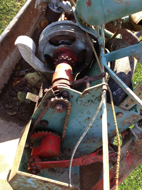 Figure 1: The clutch and chain drive to the reciprocating blade of this Atco Scythe. Exposure to the elements had taken its toll on most aspects of this machine.
