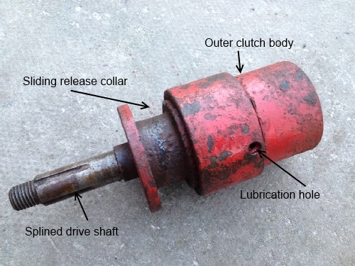 The main seizure problem was that the sliding release collar simply wasn’t (sliding) and was stuck fast to the drive shaft. The lubrication hole is of some use here because it allows penetrating oil to lubricate the engine end of the drive shaft. Note that the lubrication hole doesn’t duct lubricant on to the friction surfaces, but more lubricates components within the outer clutch body. Penetrating oil should also be introduced from the sprocket end in an attempt to free the release collar.