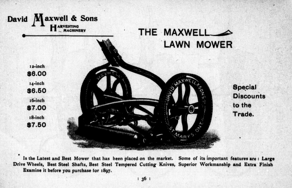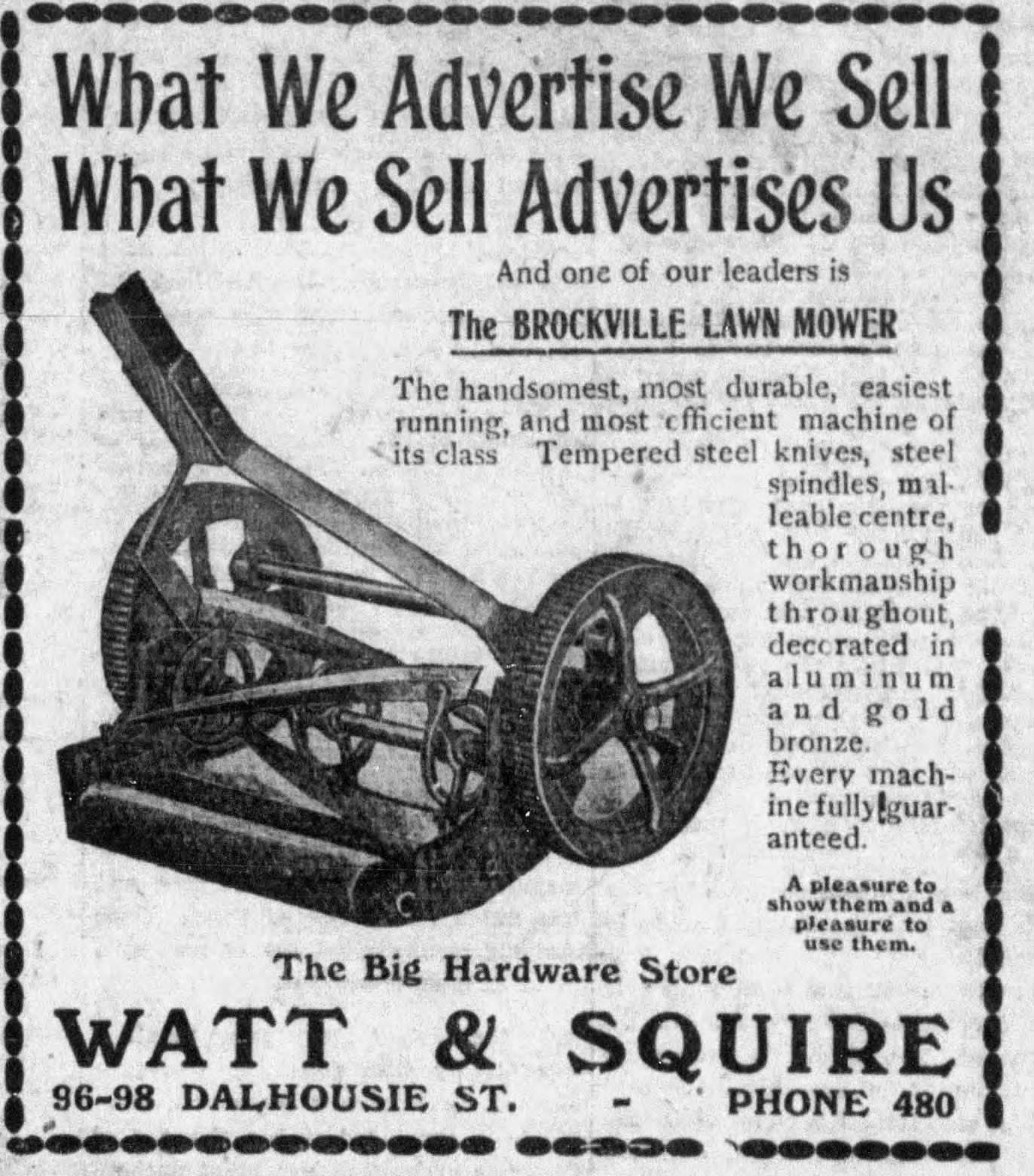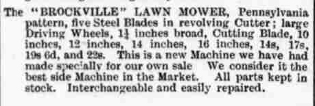 The Brockville Lawn Mower in standard & High-wheel was advertised in Canada from 1895 to 1924.