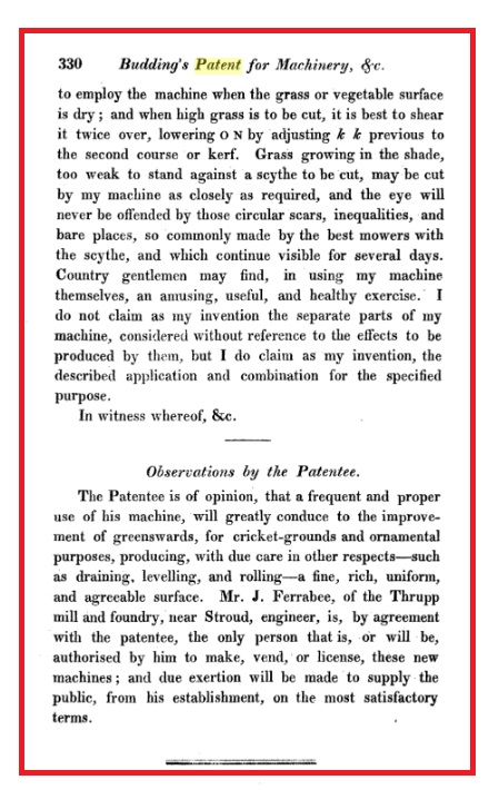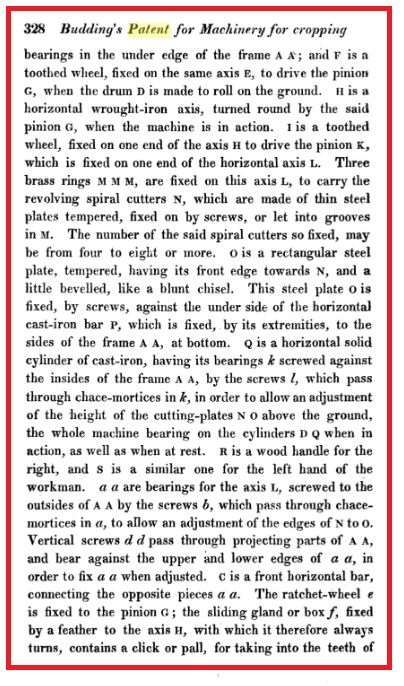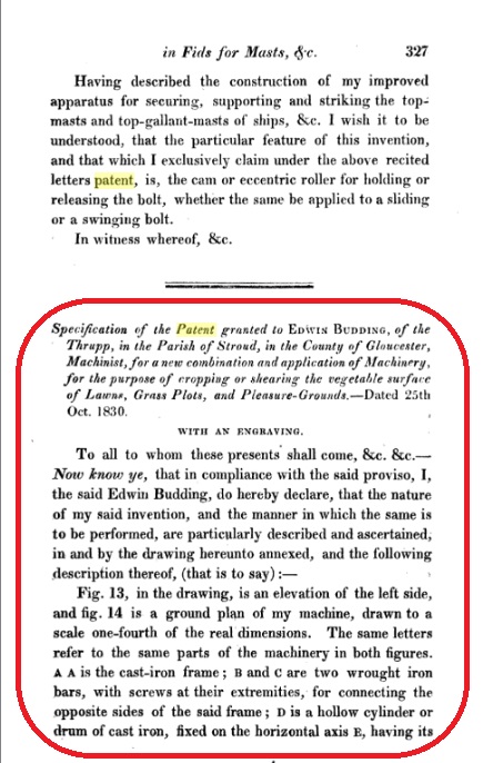 Interesting to note that many in the past have suggested that the patent ran for 25 years, they are incorrect as the 1790 Patent Act stipulated only 14 years & not amended until the 1836 Patent Act, I have a copy of the original patent issued to Budding which indeed states 14yrs, so the patent expired before he died.