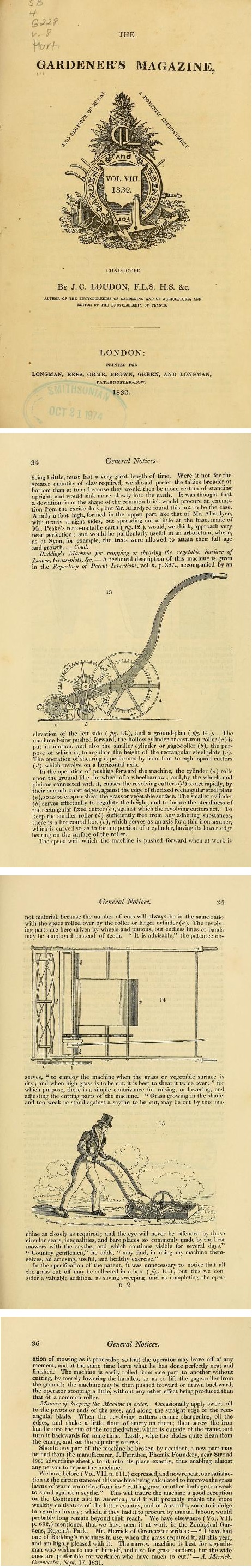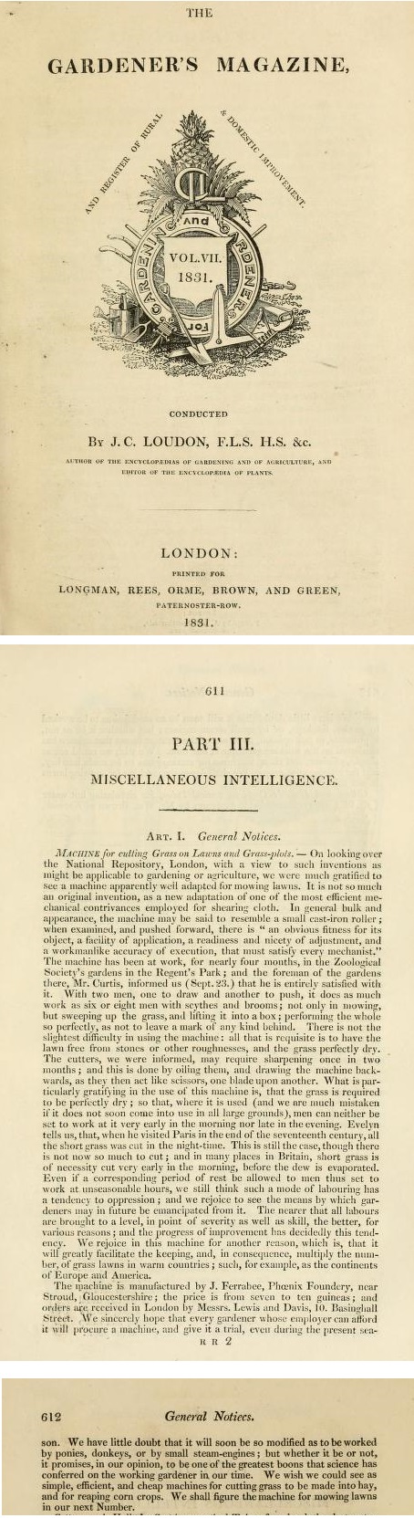 Previously I posted J. C. Loudon's famous and often mentioned 1831 article in "The Gardener's Magazine" on The first lawnmower trial's at the Zoological Garden's, Regents Park, London. Made by Budding's Patent Partner; John Ferrabee, and sold by Ferrabee's London agent; Lewis & Davies.