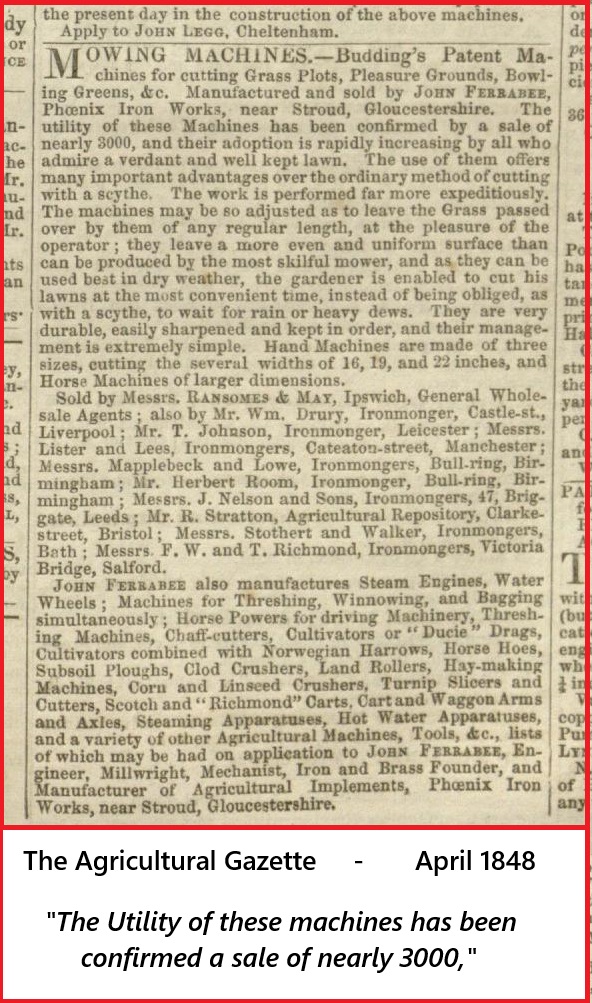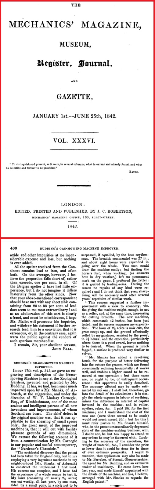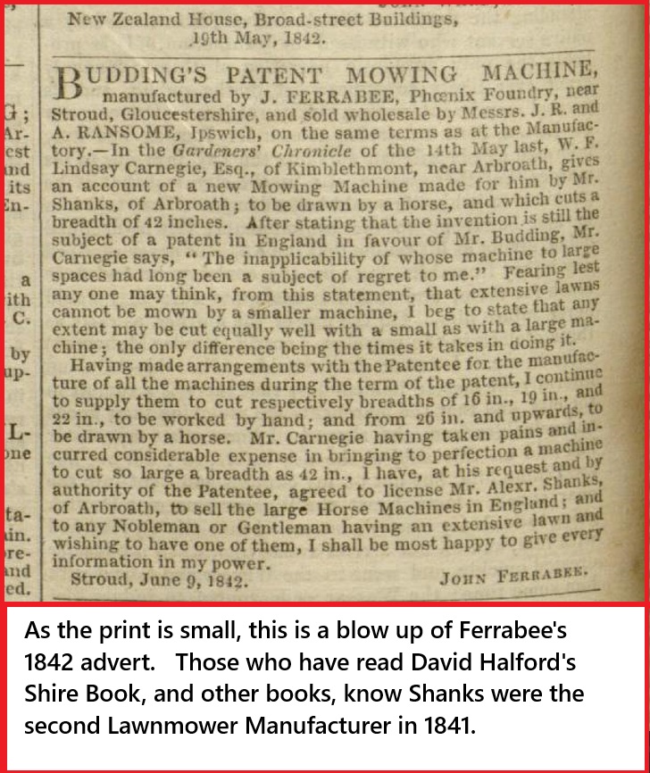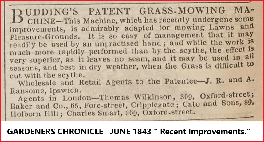 Readers may find of interest, not only in the evolution of The Budding's Patent Mower, but also that being Shank's The World's second Lawnmower manufacturer.