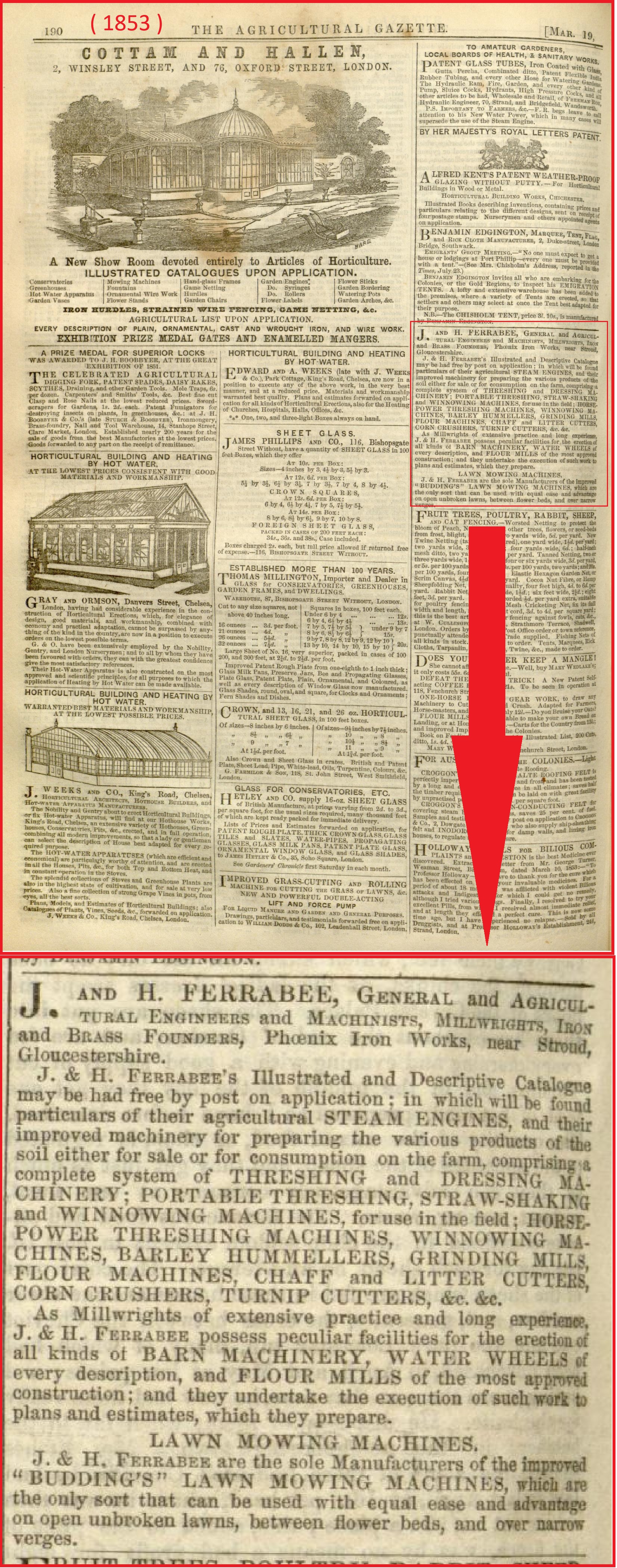 Note on previous post: March 1853, the J &H Ferrabee advert, as enlarged, but also the Buddings Patent (1830-51) engraving for Cottam & Hallen, and also at the very bottom of page 190, the advert by Dodds of London.