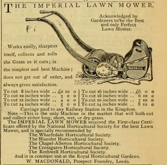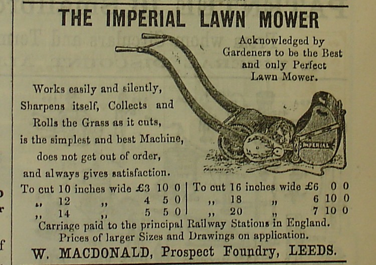 Whilst looking through the Gardeners Chronicle, on various interest streams, such as Green's Serial Numbers and when the Ransome's Automaton changed designs,  I came across this page 15th of June 1872, and saw  to the right; an advertisement for  "The Imperial Lawn Mower,"   a make I hadn't seen or heard of before!