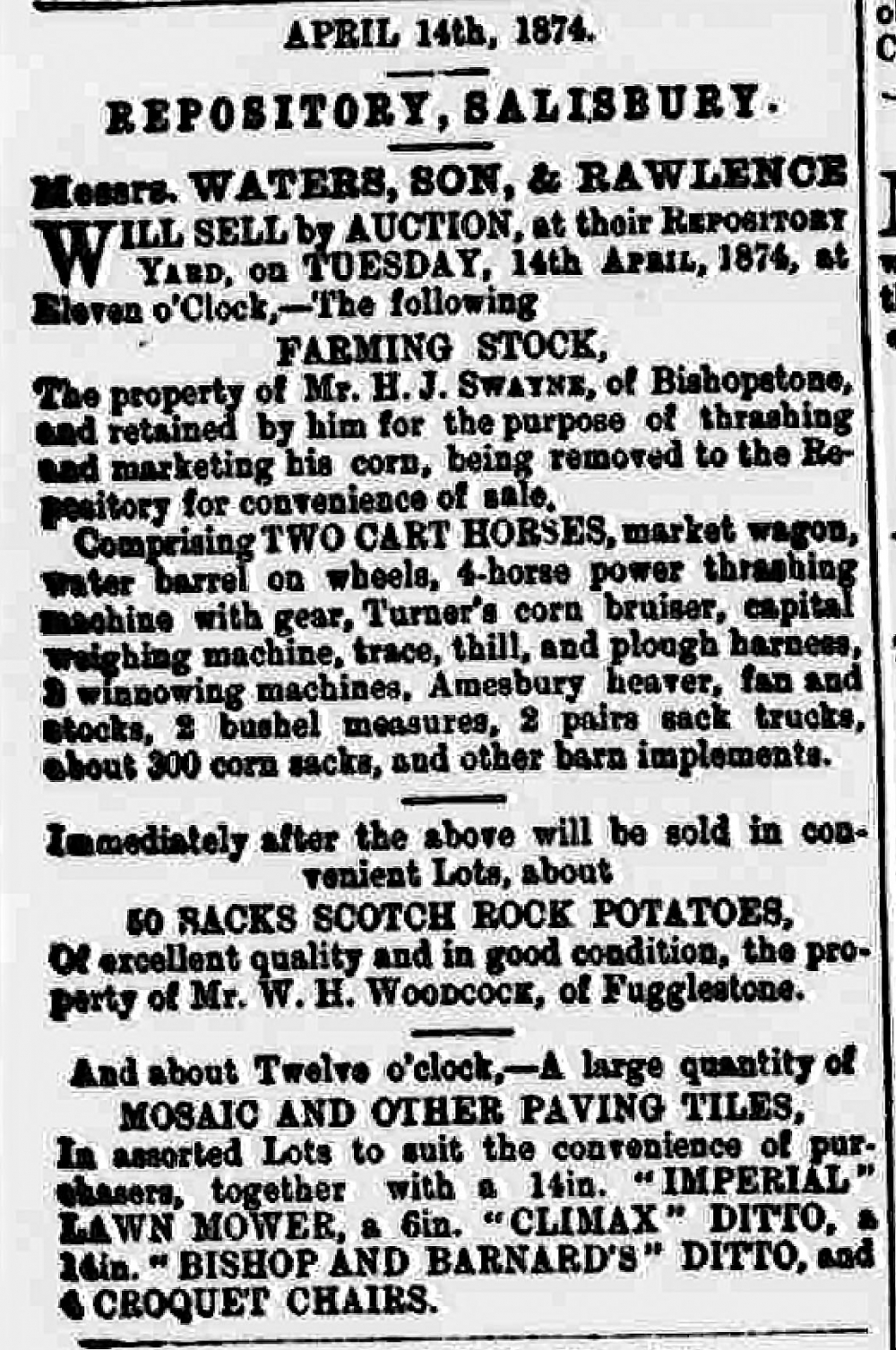Advertisement below from The Ironmonger 31st Mar 1869 & the 1874 auction in Salisbury.