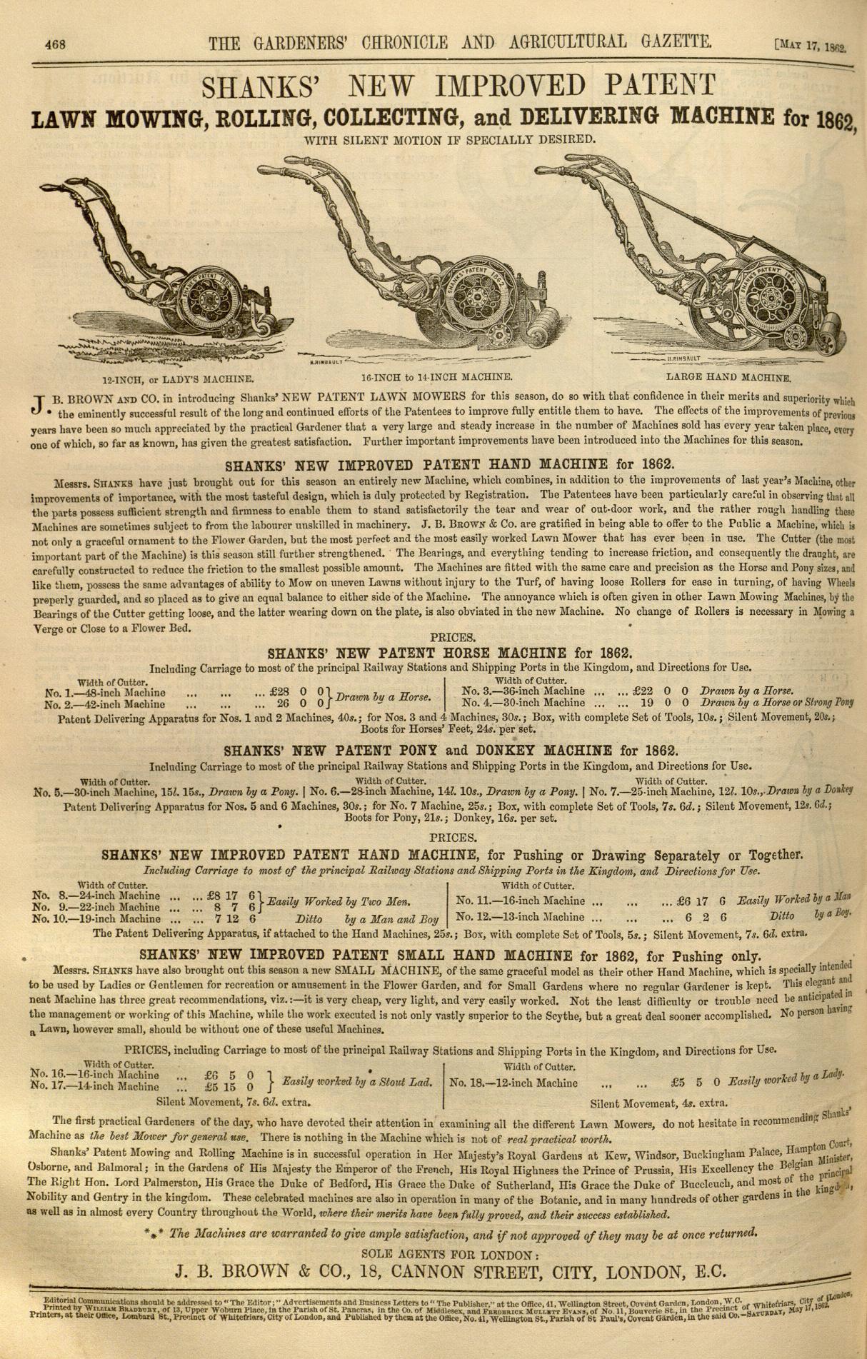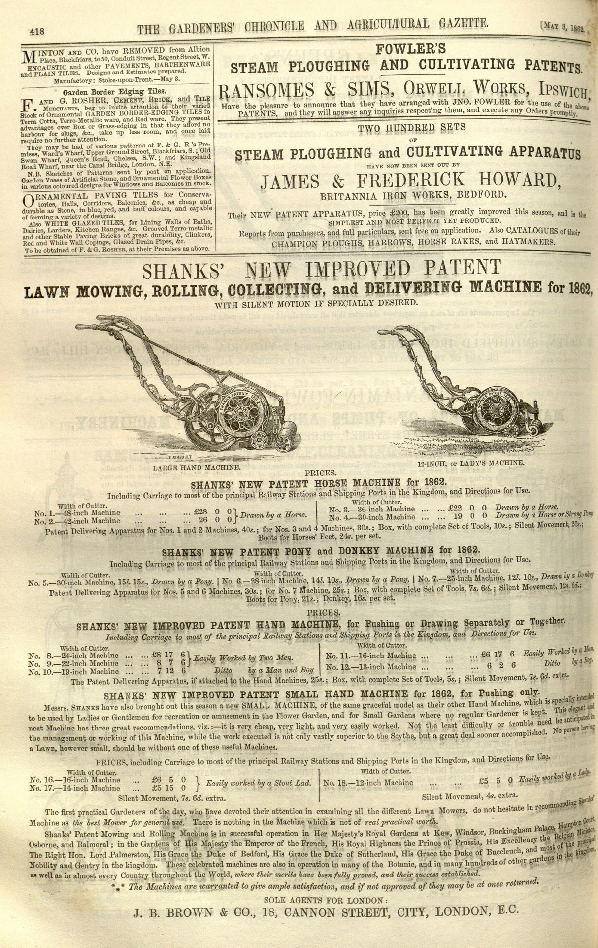 April 1862, As I posted two years ago, is the first time in the Gardeners Chronicle, that the ornate foliated design is shown. Articles by Shanks prior to April 1862 do mention improvements and features as utilised on this machine......... now we Flick forward a few weeks to May 1862 and another fine advertisement..........