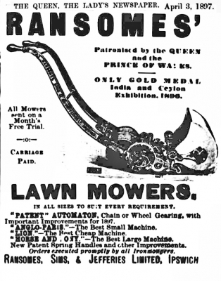 As mentioned above I dig deeper & do not rely on one source. I have spent many hours trawling through The British Library archives and have established that Ransomes Sims & Jefferies Ltd were advertising the New Patent Chain & Gear with 'Double Angle Cutters, Ribbed Driving Rollers together with an image of the new machine with ornate scraper & new style box, from March 1897.