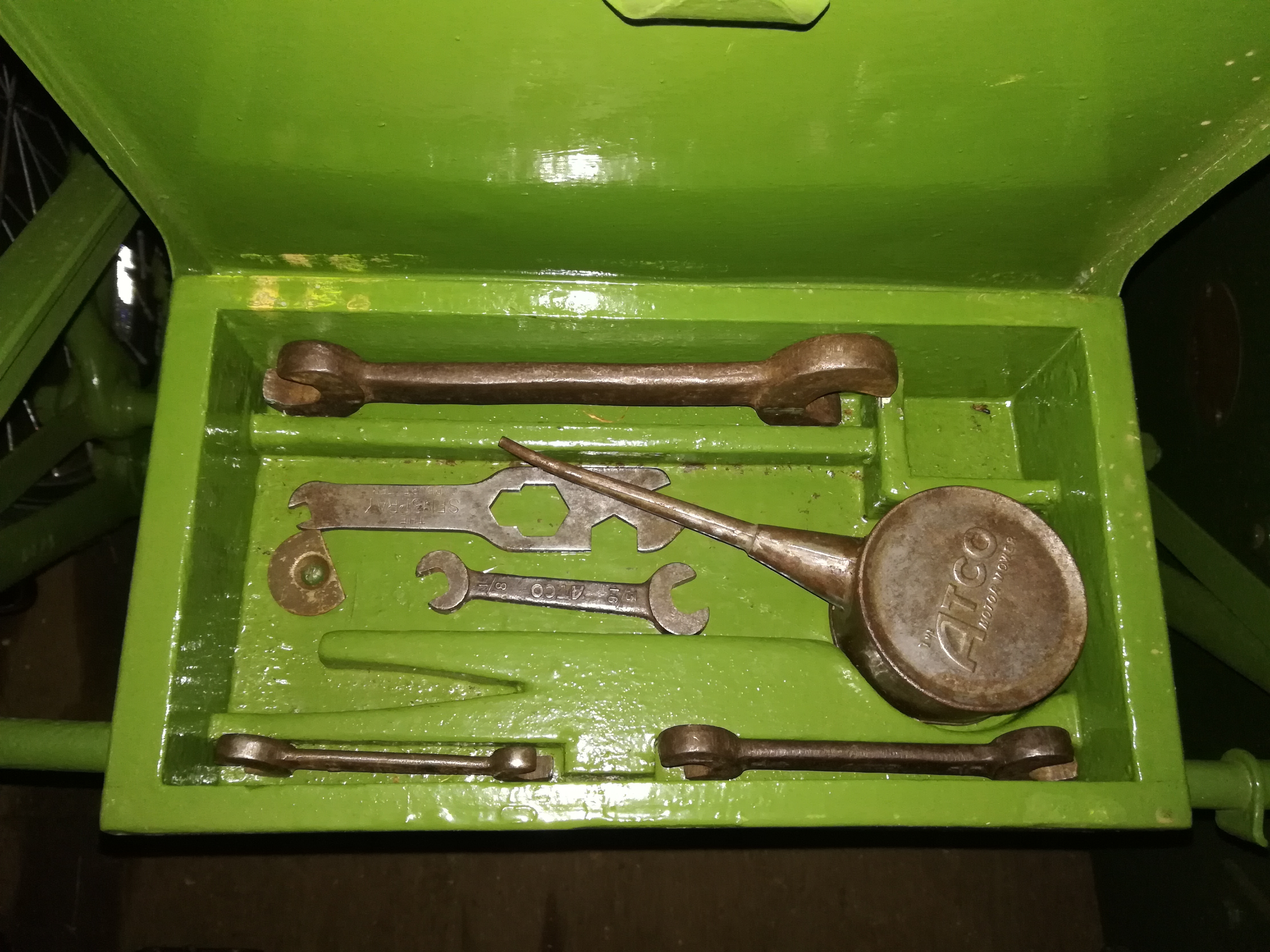 Photo of the box on my "Oval Frame". As you'll see, the box has recesses for the specific tools supplied with the mower (spanners, oil can etc).