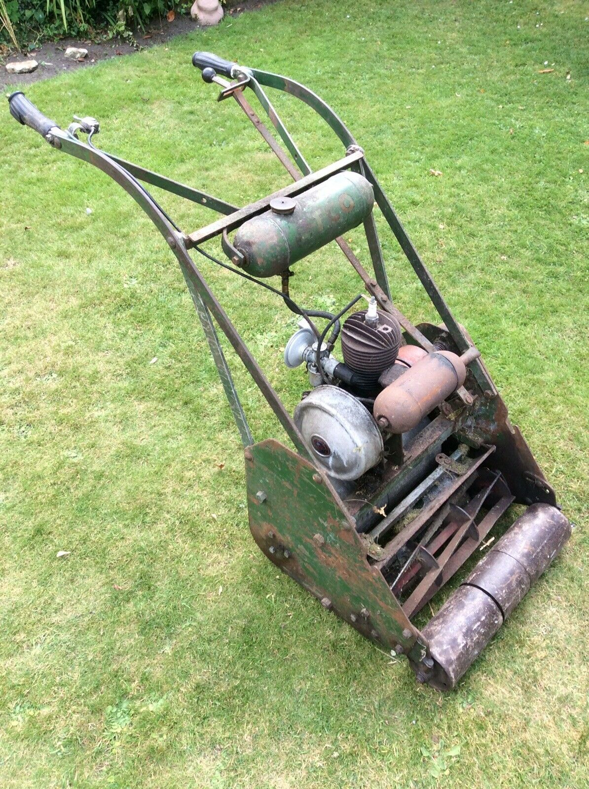 For all intents & purposes, what you have there is a shrunk Atco 28" fitted with a two stroke engine, something I have never seen, but heard about. I would date it to the late 1940s to early 1950s.