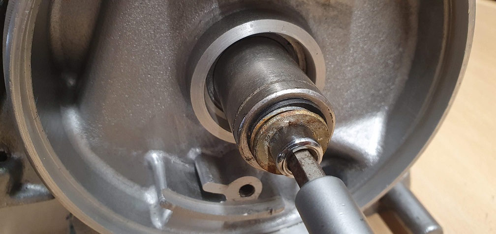 After some gentle tapping to get it square and only just started into the housing, I then used the puller I constructed to push it into place, ensuring the oil hole lined up with the one in the housing