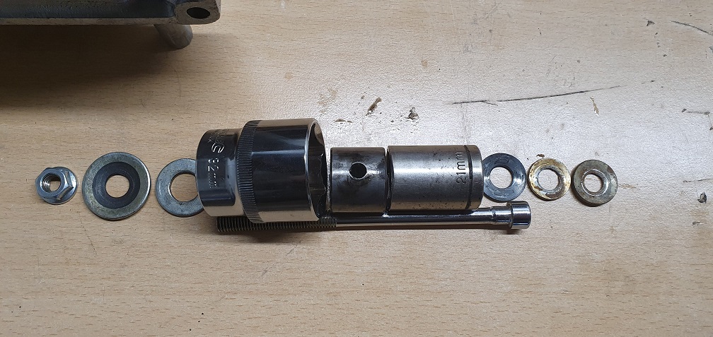 I've created a sort of puller as opposed to a drift as I figured it would be gentler on the housing rather than smacking a drift to try to dislodge the bush. The largest fitment on my slide hammer set was just the right size but I figured I would try that if my puller didn't work. The puller was a success - made from bits and pieces I had in the garage, namely a 21mm socket, a 32mm socket, some threaded bar with an allen head at one end, a 13mm flanged nut and some washers. The 21mm socket was just the right outer diameter to push the bush through and just clear the housing, and the 32mm socket was large enough to accommodate the bush as it was driven out. A 6mm hex bit in a screwdriver on one side, and a 13mm socket on the other and it had the desired effect. Plus it was good to dust off my metric sockets which have been very neglected for some time now!!