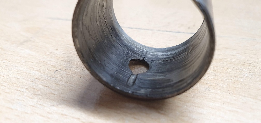 I've had to strip the other engine to check the bushings before placing my order, so I have now uncovered my first sloper thrust washer. I've taken pictures exactly how I found it for orientation reference. A completely stuck flywheel key would not budge and showed signs of attempted removal in the past. After soaking overnight in penetrating spray and trying a couple of unsuccessful removal methods, and with limited further options, I had to drill it out using a 2.5mm HSS drill which was slightly narrower than the key. I used the key from the other engine as a depth gauge and marked the drill so as not to go any deeper than the depth of the key
