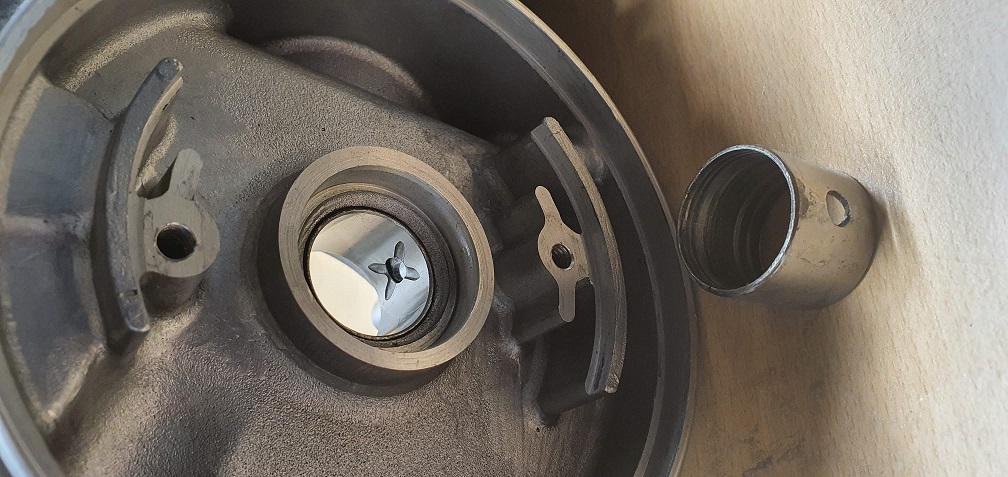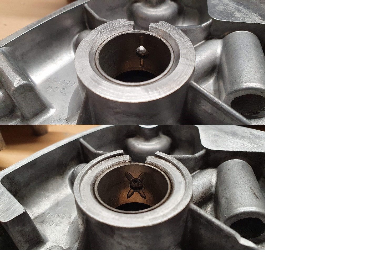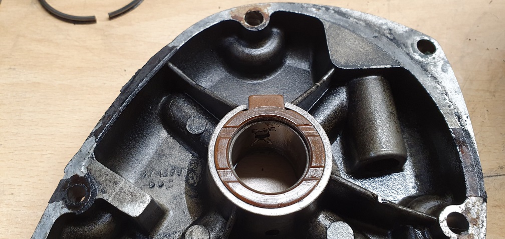 I assume the cutout at the top is where the thrust washer is located when re-assembling (like above?) The crankshaft bush in this crankcase cover is in good condition - and appears to be a slightly different design with an 'X' where the oil hole is. This crankcase cover is different to the older one I have, and has a different part number of 87-1599 presumably modified to use these thrust washers.