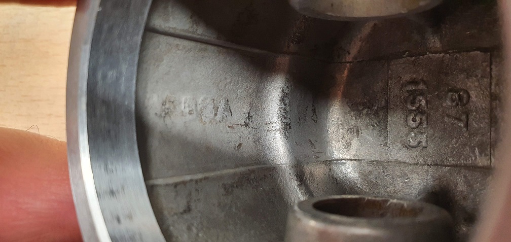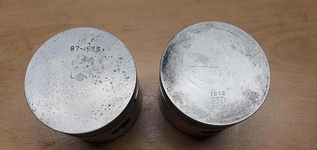 The older piston has the 87-1555 and letter L on the crown and the newer piston shows STD (assuming STanDard size) and ID.12 - and someone else's scratch marks from a past carbon removal perhaps!