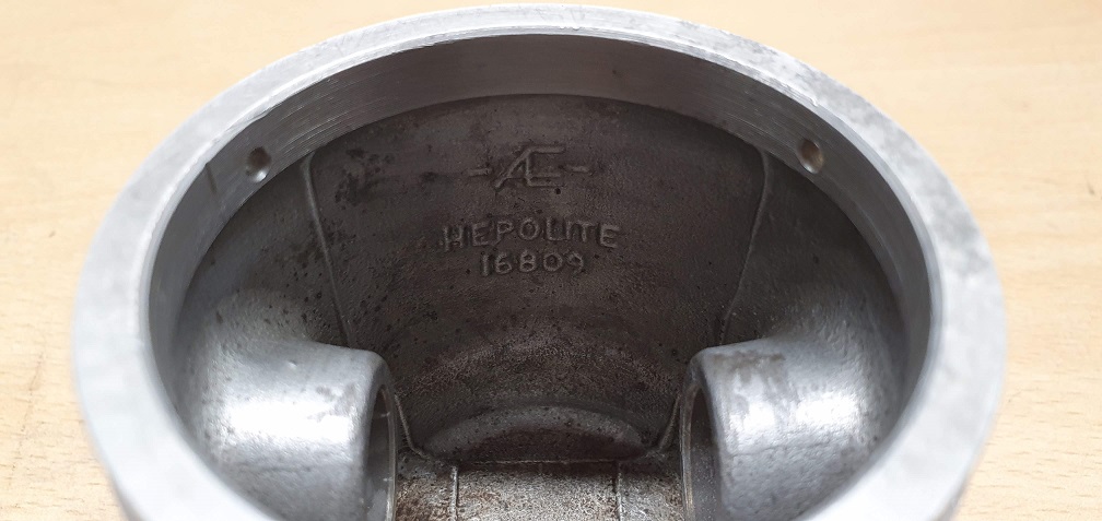 The newer engine piston is made by Hepolite with a part number 16809 and letters AE, as well as B67 and AM413