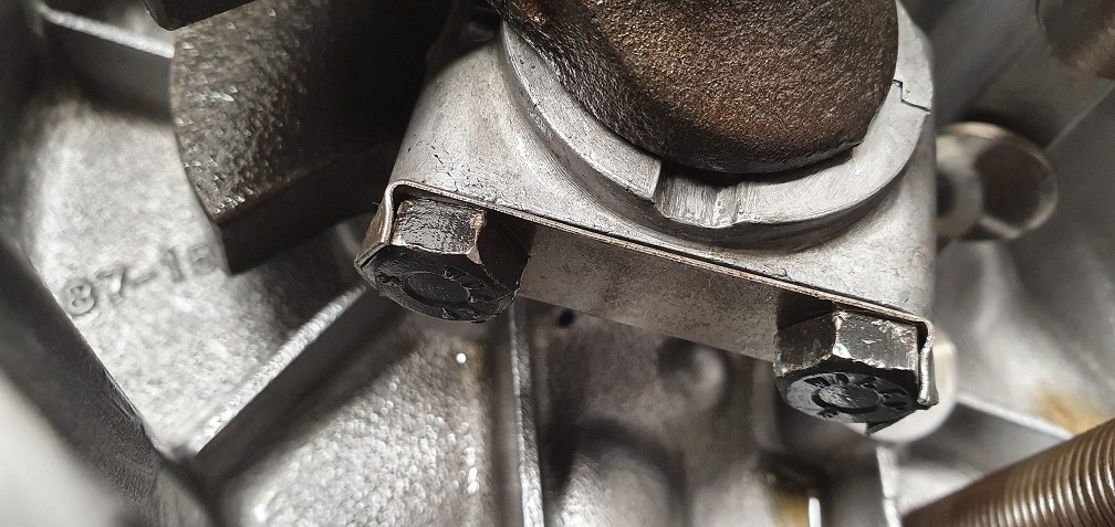 Just before I do, once I've torqued up the con rod bolts, is there a trick to getting neat 'folds' on the ends of the new con rod bolt lock washer? I remember there was more access to the whole washer on the Suffolk engine I done as the the sump could be removed, however access to the furthest side of this washer is a little limited here (bolts are only finger tight so far in the picture hence the gap between the halves)