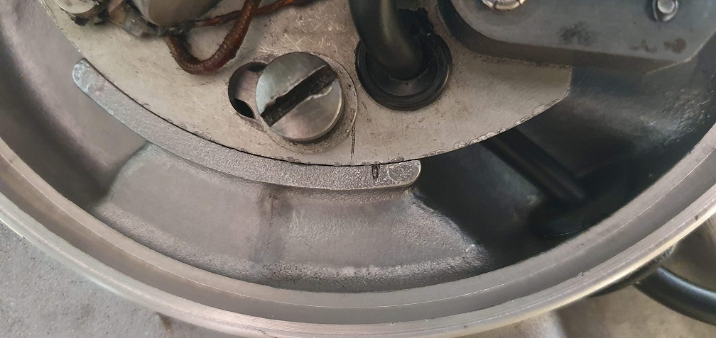 I screwed down the end of my new length of HT lead into the coil and fed it out through the rubber grommet, so that I could refit the stator plate as the points are now nice and clean after removing a fair bi of dirt and pitting. This let me check and set the ignition timing. There was a scored mark on the stator plate indicating a timing mark, not sure if from factory or someone that serviced it at some point, however it seemed a little off by watching the piston at TDC and the distance BTDC that the spark should generate. I believe the original mark was made by someone that assumed the TDC position of the piston was level with the top of the cylinder, however with this particular engine, the piston at TDC stops somewhat short of the top of the actual cylinder. I measured .125" backwards from the highest point that the piston actually gets to at TDC and made a new timing mark on the stator plate