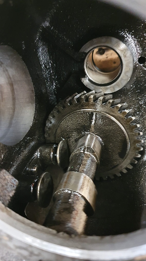 The camshaft looks fine with no visible damage or wear - easier to see the cam timing mark in this picture
