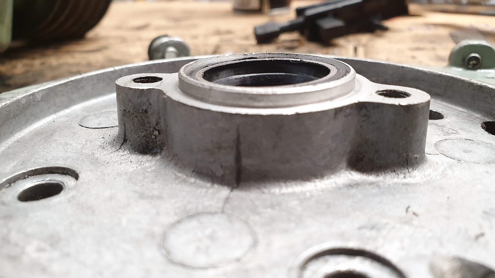 Weird stuff on the flywheel end with that lop sided seal and that crack...