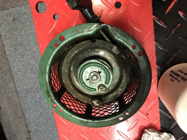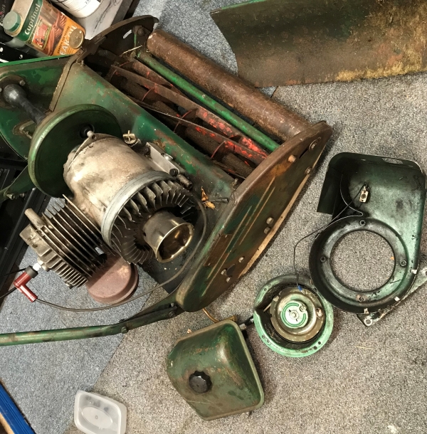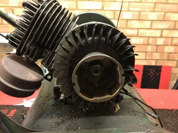 I can't get it onto the bench until mid next week for the proper dismantle - but I can't stop fiddling.. The fuel tank is in great nick internally, the 11mm bolt underneath attaching to the engine is in a daft place to remove :-) I don't think the recoil is original as only 3 screws align with the housing, but it works well enough. The grass deflector is rotten, more holes than a tea bag, may put something in the wanted section but down the list of priorities for now. Emailed The guy who did a good job on my last cylinder, wants £30 for cylinder, bottom blade and paint - no brainer!